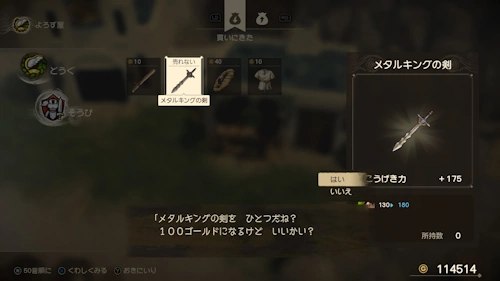 売却可能な装備品:店の人から「もう二度と手に入らないかもしれないよ」と言われるタイプ。購入価格は 売却価格の2倍 になります。例えばブーメランなら300Gで売れるので価格は600Gとなります。