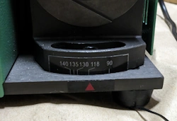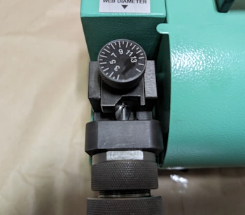 まず、ダイヤルを一度右いっぱいに回し切ってから、左に戻しながら研磨したいドリルの直径に目盛りを合わせます。本体に貼られている「Web-Diameter」というラベルの矢印が指している位置が、設定値の基準となります。