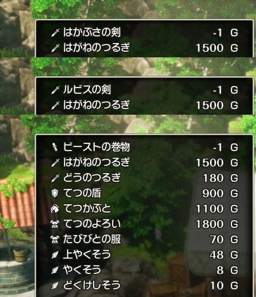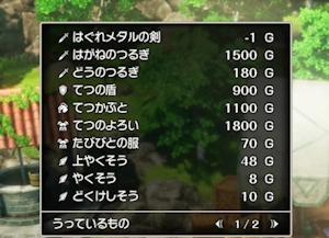 販売価格はそのアイテム本来の価格になりますが、もともと売られていない「非売品」であるならば、売値は「-1G」と表示されます。これはドラクエ3リメイクでも同じでした。この場合、購入すると計算上、所持金が1G増えることになります。