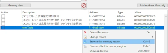 4. CEの「Item Table」にあるポインターアドレスを右クリックし、「Browse this memory region」を選択します。