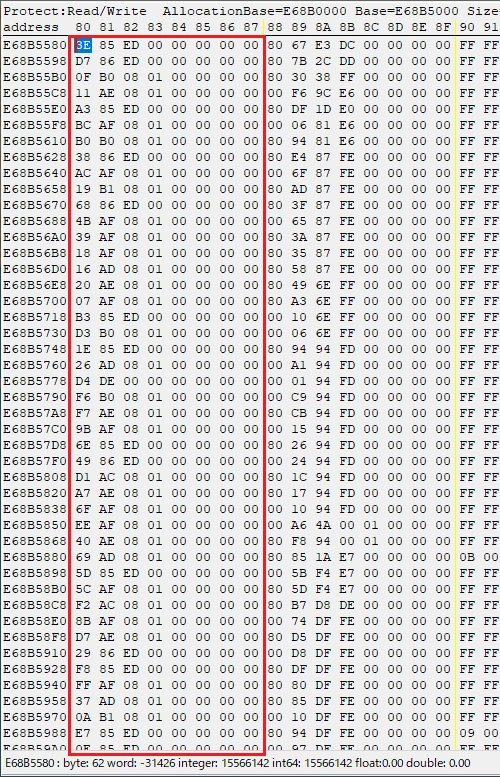 算出したアドレス(0xE68B57A8)にある値を確認します。ここに「F7 AE 08 01」という数値があったとします。